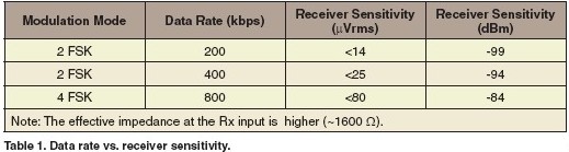 收发器允许用户随接收器灵敏度的不同,从多种数据率(200 kbps, 400 kbps, 800 kbps)中进行选择。为便于实现这一灵活性,系统采用2 FSK或4 FSK调制,每秒200或400千字符,频率偏差可变(见表1)。通过采用片外数字滤波,可以达到更低的数据传输率和相应更高的接收器灵敏度。收发器具有一个MAC旁路工作模式,在该模式下射频完全可用。在这种配置下,用户可以开发定制协议和数据传输率。