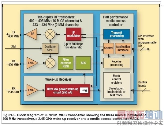 ZL70101 MICS芯片(见图3)包含3个主要的子系统:一个400MHz收发器,一个2.45 GHz唤醒接收器及一个媒体存取控制器(MAC)。根据输入引脚的状态确定芯片用作植入医疗设备,或者基站编程器的收发器。