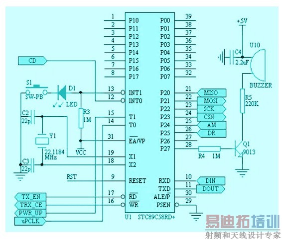 在酒店等服务行业中无线呼叫系统有很大的应用前景,而把stc89c58rd+作为控制部分应用于无线呼叫系统中将使系统功能更加 灵活。系统包括发射和接收两部分:发射部分由按键、stc89c58rd+单片机控制器和nrf905芯片组成;接收部分由nrf905、 stc89c58rd+单片机控制器和led显示以及蜂呜报警器组成。在发射器中有约定的数据代码,当按键时将数据代码送人nrf905芯片,由它向外发 射,同时接收部分由单片机控制nrf905芯片接收数据代码并显示报警。为了增强系统灵活性,发射器中的数据代码可以通过接口电路即时地输入,并且接收器收到信号后反馈信息给发射器,即采用半双工的工作方式。