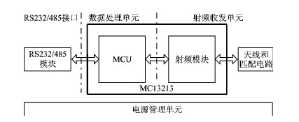 如图1所示,整个系统硬件结构由4部分组成:RS232/485总线接口单元、数据处理单元、射频收发单元和电源管理单元。