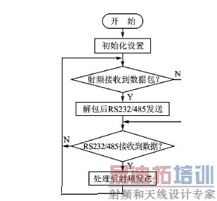 无线数据传输设备的一般工作流程如图2所示。在进行相关初始化之后就进入主循环,对射频模块和串口进行轮询:当射频模块接收到数据包时就进行解包,然后送到RS232/485总线;当串口接收到从RS232/485总线上发来的数据时,就进行相关处理并送入射频模块发送出去。这种轮询的方式结构简单,实现方便。