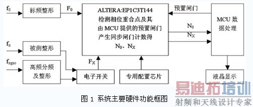 整个测频系统由多个功能模块组成,包括MCU数据处理、FPGA及其配置、高频分频、信号整形和液晶显示等,其中FPGA集合了相位重合点检测、同步闸门产生和定时计数等功能,主要硬件功能框图如图1所示。
