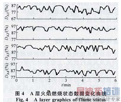 同理,设定N矩阵内的其他相应元素值,可以得到锅炉某一侧面的火检曲线图,例如:[DA1 DB1 DC1 DD1 DE1]及其变化曲线。在不同时间段、不同负荷下,锅炉每个层面的数据变化率是不同的;通过数据处理,还可以进行数据变化趋势预测,根据变化趋势判断锅炉炉膛火焰燃烧的状态,进而分析负荷的变化。