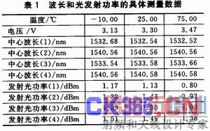 基于以上设计的TEC控制电路,分别对4只EML激光器在-10℃、25℃、75℃三种温度下进行3.3(1±10%)V的一些性能指标测试,测试的激光器是在循环箱中进行,表1为其中波长和光发射功率的具体测量数据。