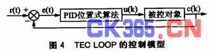 PID(Proportional Integral Derivative)控制是一种线性的调节,即比例、积分、微分控制。PID控制有模拟PID和数字PID控制两种,通常依据控制器输出与执行机构的对应关系,将基本数字PID算法分为位置式PID和增量式PID。本文中TEC LOOP控制采用了适合于温度控制的位置式PID控制算法。该算法原理简单,只是将经典的PID算法理论离散化,运用于计算机辅助测量,结构简单易于实现。图4是TEC LOOP的控制模型。