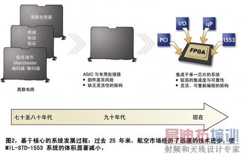 像其它军用网络技术一样,航空电子市场中的 MIL-STD-1553 测试和仿真实施也经历了从庞大的 DEC UNIbus 卡到 19 英寸的通过机架安装的组件,又发展到用于 VME 和 PCI 系统上的较小、较为集成的多通道背板,现在又出现了更小、集成度更高的 PCMCIA 接口。图 2 描述了专用的 MIL-STD-1553 ASIC 芯片制造商的实施从离散的协议和收发器芯片组精简到单一的体积小、功耗低的 ASIC 的发展过程。