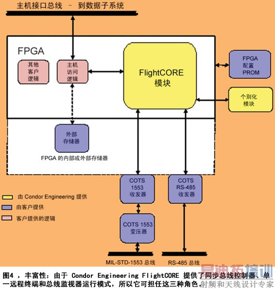 现代 FPGA 的强大功能使其成为 MIL-STD-1553 设计的理想选择,这就是 Condor Engineering 推出 FlightCORE 的原因。FlightCORE 是一种允许设计人员在各种 Altera 和 Xilinx 的 FPGA中轻松实现无版权的实例化设计的 MIL-STD-1553 IP。多数情况下,利用Xilinx 综合技术 (XST) 或 Altera Quartus II 集成综合技术 (QIS),FlightCORE 1553 可以在两天内成功地集成。如图 4 所示,用户只须将 Condor Engineering 的 IP 核心与其自身逻辑和 Condor Engineering 的个别化模块 (3mm x 3mm) 集成,即可实现高性能的 MIL-STD-1553设计。FlightCORE 还允许开发人员选择存储器的大小以恰好地与其系统需求相匹配。图4还显示了可以实施内部存贮和/或外部双端口随机存贮器。该产品还提供了 Manchester II编码与解码、信息协议验证与合法化及为接口控制和编程实施简单的共享存贮架构等所有的必要组件。只需增加外部收发器即可,如标准的COTS MIL-STD-1553或RS-485收发器。