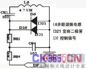 滤波器电路采用并联谐振电路,并联谐振电路在中心频率处,具有信号幅值最大的输出比。同时并联谐振电路具有很小的功率损耗,广泛用于带通滤波。我们采用电感加电容的并联谐振,电感采用精度较高的铁氧体线圈,电容采用能改变极间电容的变容二极管(SVC321)。并联谐振电路如图2。