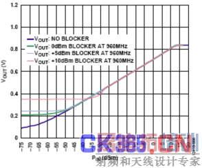 图6显示存在960 MHz的阻塞信号时,电路在900 MHz时的性能。 阻塞信号与载波信号相差60 MHz是因为滤波器在该频率时的通带抑制性能有所下降(见图7),从而构成该电路的最不利测试状况。 当阻塞信号输入电平高于−10 dBm时,阻塞信号会降低电路的下限灵敏度。但是,对于不超过+5 dBm的阻塞信号,电路仍会保持65 dB的动态范围。