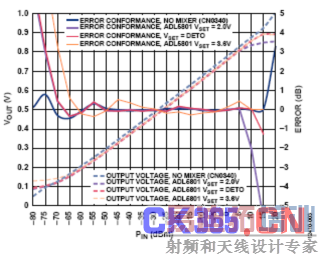 利用ADF4351控制软件设置将输入信号下变频至140 MHz中频所需的LO频率。 然后逐步提高输入功率水平,并测量电路的RMS输出电压,从而确定电路的传递函数和误差一致性曲线。