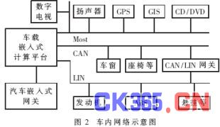 汽车嵌入式计算平台为实现各种功能服务提供了良好的软硬件平台。车外网络和车内网络结合构成了汽车/家庭/社会一体化的互动体系结构。该体系结构示意图见图1,车内计算网络示意图见图2。