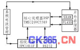 指纹模块基于TI 公司的TMS320VC5509 高级数字DSP处理器为主核,芯片结构框图如图3 所示。高精光学采集头(TFS-D0307),高速、稳定; 标准UART 接口通讯,标准8 字节通讯协议, FPI 完成处理接收到的指纹信息, 并与Raspberry Pi主控模块通讯的工作。