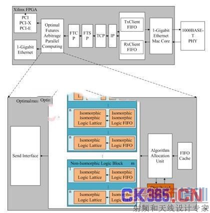 图3-1为系统结构图,主要由数据接收模块、股票信息并行处理模块、数据发送模块组成。数据接收模块主要负责协议包的跨层解析以及包过滤。股票信息并行处理模块是整个系统的算法核心,采用高速并行方式分析股票信息,计算相关指数,并通过数据发送模块快速发布。在股票信息并行处理模块中,算法定向单元负责调度下层的异构逻辑块,异构逻辑块通过同构逻辑晶格完成最基础的数据计算。在股票信息并行处理模块中,将所有的数据存储于FPGA内部的分布式RAM中,突破了IO传输的瓶颈。