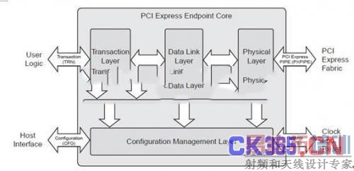 在本系统中主要采用单点的PCI-Express Endpoint与PC机通信,PCI-Express Endpoint功能结构与接口如图9所示,数据主要依次通过Transaction Layer、Data Link LayerPhysical Layer三层传输到另一端。用户可以通过Configuration Interface对PCI-Express进行配置。