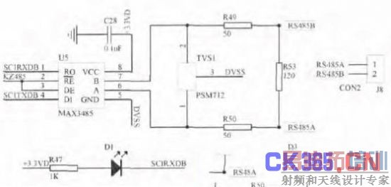 TI 公司的TMS320F2812 芯片有两组SCI 模块,SCIA 和SCIB。根据不同的需要,可以将这两个串口分别设计转换成RS232 和RS485。本文采用RS485 实现DSP 和触摸屏的串行通信,RS485 通讯相对于RS232 通讯来说有抗电气干扰和传输距离远的优点,所以在工业控制现场,利用RS485 串口和触摸屏LEVI700L 进行通信。如图1 所示是将SCIB 口通过MAX3485 芯片设计成半双工方式的RS485 接口,即数据可以在两个方向传输,可是不能同时传输。图中RE、DE 引脚为发送和接受使能端。DSP 通过将引脚PWM2(A1)口设置成通用数字I/O 口来控制使能端为1 或0,即接收或发送。A、B 引脚通过静电保护芯片PSM712 连接到RS485 的接收端RS485A 和发送端RS485B。图中D1 和D3 发光二极管是为了监测DSP 正在接受或者发送数据。