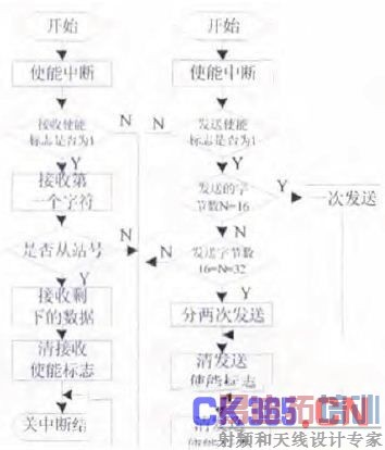 从图3 可以看出,DSP 的程序设计主要包括初始化,接收和发送中断子程序,MODBUS 帧解析、处理及回应子程序,CRC 码验证子程序。其中接收和发送中断子程序的流程图如图4 所示。