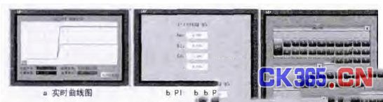 3)触摸屏和DSP 通信试验和调试:通过上述两个部分的调试后,按照图1 所示的硬件连接线路将DSP 和触摸屏连接起来。在此之前,需要将调试好的组态画面程序下载到触摸屏中,C 语言程序固话到DSP 的Flash 中。最后,若通信成功,可从触摸屏中看到相关数据,如图5 所示a 为实时曲线图,b 为PID 参数调节图,其中给定电压、电流,PID 参数可以在线修改,c 为权限设置界面,不同的工作人员权限不一致,在修改某些参数时需要输入密码。