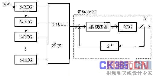 实现FIR滤波功能的基本元素包括乘法器、加法器、延迟单元以及存储单元等,其中乘法器的设计最为复杂。用 FPGA技术作乘累加运算通常有移位相加、加法器树、查询表和逻辑树等设计方法,不管采取哪种方法,要实现一个高阶的数字滤波器都将占用相当大的资源。相比较来说,采用分布式运算DA算法(Distributed Arithmetic)的FPGA设计无论是在逻辑资源占用上,还是处理速度上都具有很大的优势,特别是对于基于SRAM结构的FPGA更加适合于DSP 功能的设计。ビ泄谼A算法早期比较著名的阐述,是在1974年由Abraham Peled 和Bede Liu在讨论数字IIR滤波器和FIR滤波器硬件设计时涉及到,1975年在IEEE Proceedings中Freeny发表了一篇关于DA算法在贝尔实验室电话系统中应用的论文,同时惠普公司的Kai-Ping Yiu提供了一种有关符号位的DA设计方法;此后,西门子H.Schroder以及RICE大学C. S. Burrus 在提高算法的处理速度方面做了深入的研究。随着大规模集成电路技术的发展,特别是可编程逻辑器件的发展,DA算法在数字滤波器硬件设计中的研究进一步加强,SDA(串行DA)算法和PDA(并行DA)算法已成为FPGA实现DSP功能最为有效的方法。根据DA算法设计的思想,我们进行FIR滤波器设计如图4所示。
