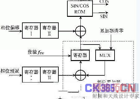 NCO的硬件结构如图2所示,主要由相位累加器和SIN/COS表构成。相位累加器产生的相位作为地址去查找ROM表,查到的SIN/COS值即本地载波的数字频率送至乘法器,完成混频。在实现NCO时有以下参数值得注意: