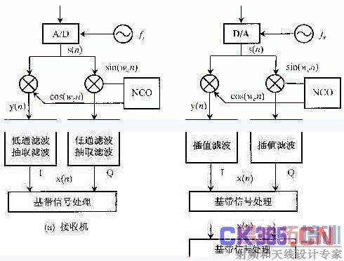 根据图1所示数学模型,FPGA在软件无线电中的应用主要体现在数字上变频DUC和数字下变频DDC中。经过 A/D采样后的信息直接送给FPGA,在FPGA中完成本地混频,把中频信号搬移到基带信号,然后经过低通滤波和多级抽取滤波,降低信息的采样速率,由 FPGA送至通用DSP,实现基带信号的调制解调;对于数字上变频结构,和下变频有完全对称的结构,所以分析时仅以接收机为例。