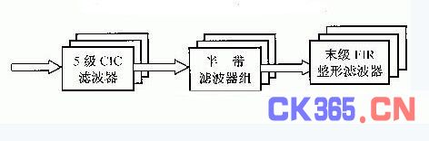 下变频过程中经过混频后的信号必须进行抽取滤波,以便降低抽样速率,使得通用的DSP对基带信号处理时有充足的时间完成运算;同样,在上变频过程中,首先要进行插值滤波,提高抽样速率,从而实现在IF范围内频谱的搬移。ジ据DDC总抽取因子的大小,我们把数字下变频分为两类:即当抽取率大于32时,认为是窄带下变频,反之则认为是宽带下变频。无论是宽带还是窄带,一般都采用FIR结构实现抽取滤波器,但对于窄带下变频,由于抽取因子较大,所以其抽取滤波器组也更为复杂一些。参考古得曼(Goodman)和开莱(Carey)提出的设计多级抽取器和内插器的经典模型[3],对窄带下变频作如图3设计,其中CIC滤波器为整系数滤波器,滤波时无需乘法运算,而半带滤波器有一半系数为零,这样在滤波时大大减少了计算量。