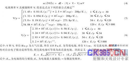 自由电子在HPM电场作用下,将沿电场方向产生一定的有序运动,以速度v运动的电子受电场的作用力为eE,在地磁场B0下受到的洛仑兹力为ev×B0,通常可以忽略微波波段地磁场的影响;电子在单位时间内同其它粒子碰撞而损失的动量为(νm+νi-νa)mv,其中νm为碰撞频率,m为电子质量;因此电子的运动方程为[1-5]