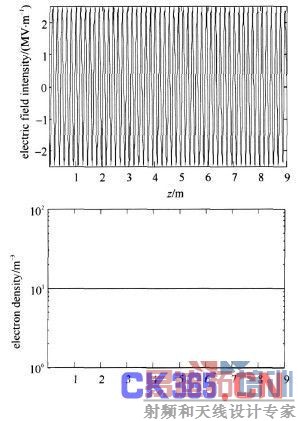 根据以上给出的计算方法,用Fortran语言编写了计算机程序。设HPM矩形脉冲的电场强度幅值Em=2.5×107V/m,频率f=1.7 GHz,脉宽为30 ns;模拟的海拔高度h=0 km,模拟的空间长度l=9 m,网格步长δ=3×10-3m,时间步长Δt=10-13s,初始电子浓度为10 m-3。仿真得到该微波脉冲在混合气体内传播时,各时刻空间场强和电子浓度的分布图,如图1所示。可以看出,微波脉冲在混合气体中传输时电场强度和电子浓度的变化过程。由于入射脉冲的作用,空间各点的电子数密度开始呈现指数增长,在1 ns之后,混合气体被击穿,同时脉冲幅度开始急剧下降,出现了严重的尾蚀效应。击穿之后的混合气体以电子的复合为主,但复合频率较小,约为4×107Hz,而且由于电磁脉冲的持续作用,混合气体内的电子数密度几乎保持不变。