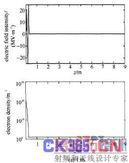 分别设置HPM矩形脉冲的电场强度幅值为2.5×106V/m和1×107V/m,其余参数不变。由仿真得到不同幅值脉冲进入混合气体的传播过程,分别给出t=30 ns时空间电场强度和电子数密度的分布图,如图2所示。