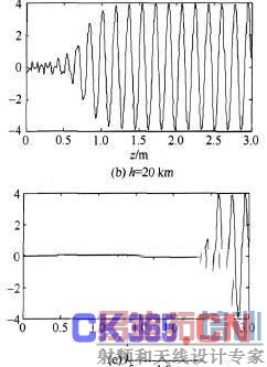 同样,设置频率f=1 GHz,脉宽为20 ns,仿真还能得到不同海拔高度下HPM大气击穿阈值Ebreak,如图4所示,分别与文献[1]和[3]中近似解析方法计算得到的击穿阈值进行比较可知,本文计算得到的击穿阈值随高度变化的趋势与文献[1]和[3]中的结果有很好的一致性;且各点的击穿阈值均大于近似解析解。从图中也可以看出在海拔高度40~50 km,大气最容易发生击穿,这通常被称之为“易感层”。