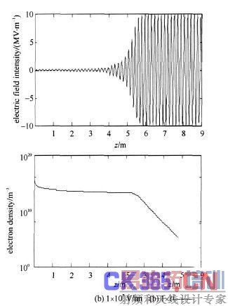 从图2(a)可以看出,当脉冲幅值为2.5×106V/m时,混合气体没有发生击穿,空间各点电子数密度变化不明显,能量全部透射过去;由图2(b)可以看到,当脉冲幅值为1×107V/m时,混合气体发生击穿,透射脉冲出现明显的尾蚀效应,电子数密度在击穿之前随时间呈指数增长趋势,击穿之后电子数密度基本保持不变。因此在相同条件下,脉冲幅值越大越容易造成大气击穿。