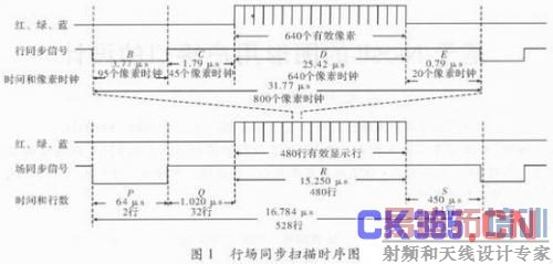 根据上述的时序参数以及目标板上的时钟频率,对其行频和场频的时序控制采用点和行计数的方法,场信号和行信号按照时序图设计,当像素或行数达到相应的状态后即改变场信号和行信号的值。系统所需的像素时钟可以用锁相环实现。