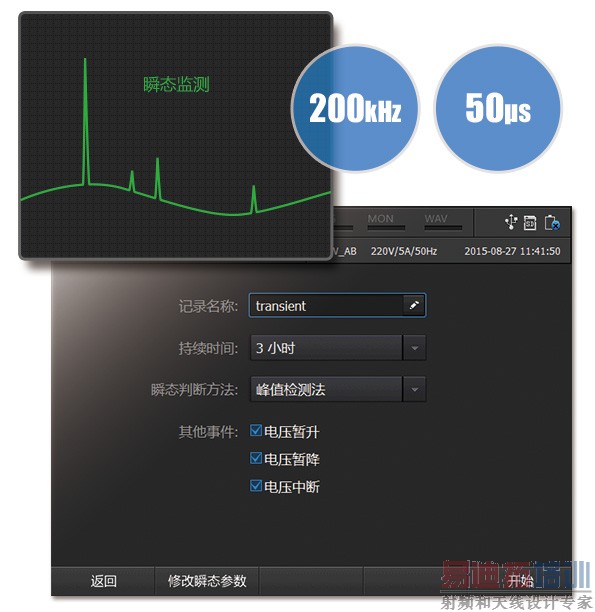 电压波形瞬变在电网中时有发生,对波形或峰值敏感元器件有较大的危害,波形瞬变通常持续时间短、幅值波动大,在电压有效值上无法体现。E6500支持瞬态测量,采样率可达200kS/s,最短可捕获50μs的波形畸变,幅值可到6000V。