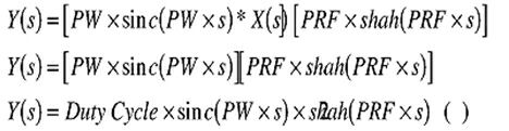 为了查看一个脉冲调制信号的频率响应的频谱是什么样子,我们首先从数学上分析时域响应。公式1给出了一个脉冲调制信号的时域关系。它的产生步骤是首先建立一个用脉宽为PW的矩形窗加窗的信号。然后产生一个Shah函数,这个函数包含一个间隔为1/PRF的周期脉冲序列,其中PRF是脉冲重复频率。这也同可以看作是间隔和脉冲周期相等的脉冲。而后加窗信号和Shah函数卷积,产生一个和脉冲调制信号相应的周期脉冲串:
