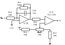 脉搏传感器所输出的电信号过于微弱,必须对其放大后再输出给模数转换元件。按人体脉搏在运动后最高跳动次数240次/min计算来设计低通放大器,并由IC2A和C04等组成,如图2所示。转折频率由R07、C04、R08和C05决定,放大倍数由R08和R06的比值决定。