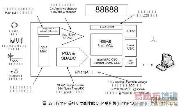 利用测试试纸做为葡萄糖讯号的撷取来源,以固定偏压方式激发试纸与血液的电化学反应成为电流讯号输出,再经由纮康科技的单片机“HY11P13 ” 量测电流讯号、运算、数字输出显示,如图 1,以最少的组件达成偏压式电流量测方案。