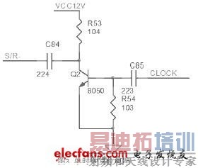 磁阻传感器在制造过程中,选定沿着薄膜长度方向为轴,当玻膜合金薄膜受到强磁场干扰时(大于20gauss)薄膜磁化极性会受到破坏,需要对传感器施加一个瞬态强磁场来恢复或保持传感器特性,这个过程只要DSP提供一个置位或复位脉冲CLOCK信号即可。图3为单时钟复位电路,其中CLOCK接DSP的一个GPIO口,S/R-接HMC1052的8脚,相应HMC1052的第六脚接地。