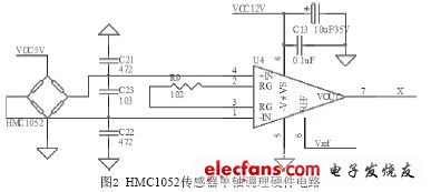 磁阻传感器HMC1052是一个双轴线性磁传感器,每个传感器有一个由磁阻薄膜合金组成的惠斯通桥。当加上供电电压,传感器将磁场强度转换为电压输出,通过一个仪用放大器即可将信号电压放大到AD采样电压量程范围。HMC1052的磁场测量范围是±6gauss,灵敏度是1.0mV/V/gauss。当5V电压供桥时,传感器满量程输出电压范围±30mV,DSP自带内部AD量程为0-3V,因此将仪用放大器参考电压设定为1.5V,放大倍数设置成50倍,即可达到AD满量程。利用磁原理,传感器HMC1052测量工件表面散射磁场法向分量Hp(y)沿坐标X-Y分量,通过计算、误差校正,由公式:Hp=√X2+Y2即可得到Hp(y)值。Hp(y)符号与测量基准方向Y的符号相同。图2为HMC1052传感器单轴调理电路,另一轴调理电路与图2相似。