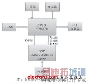 系统整体实现流程为:传感器采集铁磁性零件表面的磁记忆信号,DSP通过内部自带AD转换器,对传感器的信号进行快速采集、高速处理、提取特征信号后,DSP通过总线方式将信号传给CPLD,CPLD将波形显示信号存入显存SRAM中,然后再将SRAM中存储的TFT显示屏的一帧波形数据在TFT屏上用波形显示,因此一旦屏上波形出现过零点,即可判断此处存在应力集中。为了方便系统的人机交流,系统中增加了按键和蜂鸣器,按键负责系统相关参数的设定,当检测到应力集中区域时,蜂鸣器负责报警。图1为检测仪的硬件结构图。