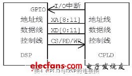 TMS320F28335通过四位地址总线(XA[11:8])、数据总线(XD[11:0])、外部读写使能信号(RD、WR)、片选信号(CS)及I/O中断信号与CPLD相连,由这些信号连线完成DSP对CPLD内的相关寄存器或I/O的读写操作。挂接在CPLD上的所有外设DSP都可以通过地址线XA[8:11]来分配一个对应的地址,当在DSP中执行写指令:*(0x0400)=0x001时,地址总线XA[11:8]=0100B,数据线XD[11:0]=0x001,同时控制线中CS、WR为低电平,RD为高电平,CPLD接收到总线电平后,进行地址锁存、数据译码等操作,即可对相应地址上分配的外设进行控制。CPLD与DSP的连接关系如图4所示。
