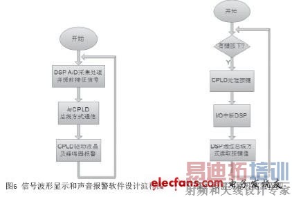本仪器所实现的主要功能有:漏磁信号采集处理、信号波形液晶显示、声音报警和按键功能设定。其中信号采集由DSP内部AD中断完成,只需要设置好相关寄存器即可。由于波形显示和声音报警是直接由DSP通过总线将命令发送到CPLD;而按键功能设定是:当按键按下后由CPLD通过中断来通知DSP,然后DSP通过总线读取按键值,根据这些功能画出如图6、7的系统软件流程图,分别表示两块CPU各自内部程序流程。图6为信号波形显示和声音报警软件设计流程图,图7为按键功能设定流程图。