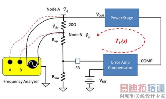 其结果是,AC波动出现在跨该断点的两个节点(A和B)处。该频率分析仪具有两个接收器,能测量节点A和节点B处的信号vA和vB。您可用方程式1计算出该系统环路增益TV:
