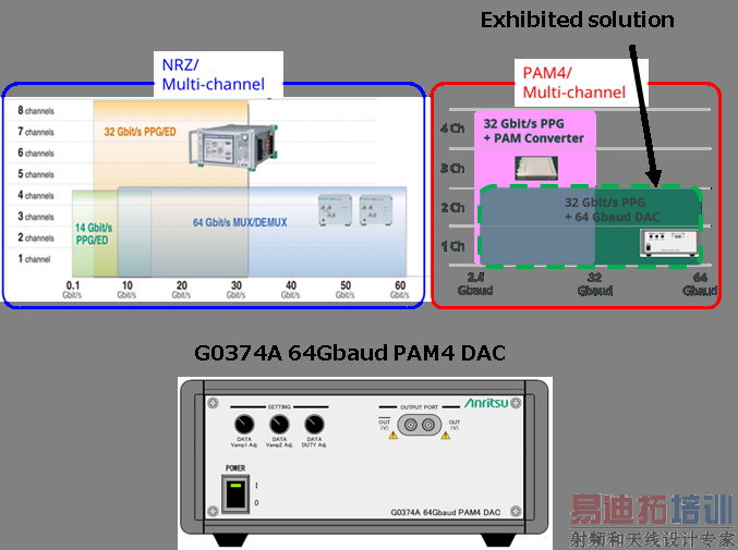 尽管安立的信号质量分析仪MP1800A系列支持器件和光模块评估并符合最新的通信标准, MP1800A系列多通道脉冲码型发生器(PPG)和误码检测器(ED)通过使用G0374A 64 Gbaud PAM4 DAC和MP1862A 56G/64 Gbit/s DEMUX可以很容易地扩展以支持高波特率的NRZ和PAM4以及BER测量。