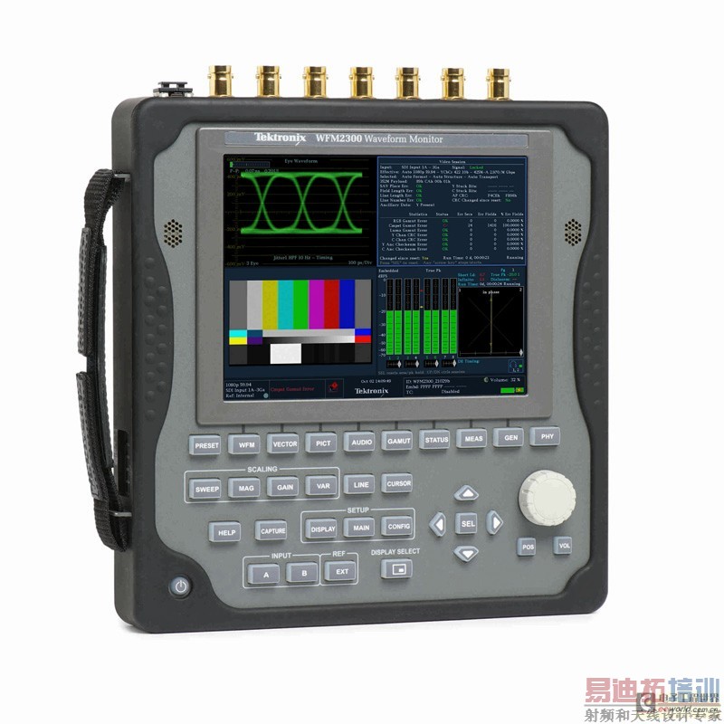 WFM2300极其便捷(高8.5英寸x 宽8.2英寸 x 厚1.4英寸,加上电池总重4磅),耗电量低,带有采用LED背板的明亮大尺寸LCD屏和可更换电池,是工程师在现场或广播设施中查除问题的理想选择。眼图/抖动测量功能可帮助识别物理层的问题;电缆模拟和余量测试功能(泰克独有)能够帮助确定系统的同轴电缆余量,以确保其不会达到“数字突变”(digital cliff)而使得传输误码率显著增加。工程师还能使用各种状态显示来确保遵守各种标准以及验证音频、视频和数据规范。从支持Genlock(同步锁相)功能的嵌入式测试信号发生器输出的视频/音频测试信号,可用于识别穿过同轴电缆和光纤接口的信号路径。