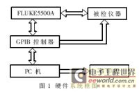 基于GPIB的数字示波器自动检定系统的硬件由GPIB控制器、FLUKE5500A、被检定数字示波器和PC机以及打印机等外围设备组成。系统组成如图1所示。