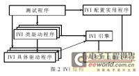 IVI(InterchangeableVirtualInstrument)是IVI基金会为了进一步提高仪器驱动程序的可执行性能,达到真正意义上的仪器互换,实现应用程序完全独立于硬件而推出的仪器驱动程序编程接口。IVI系统由IVI类驱动程序、具体驱动程序、IVI引擎、IVI配置实用程序、IVI配置信息文件五部分组成。类驱动程序实现了上层统一功能的封装,面对的是操作者,而具体驱动程序完成与具体仪器的通信。测试程序是调用类驱动程序,用类驱动程序调用具体驱动程序来实现测试程序和硬件的无关性。IVI引擎完成状态缓存、仪器属性跟踪、分类驱动程序到具体驱动程序的映射功能。IVI配置实用程序是采用软件MAX创建和配置IVI逻辑名,在测试程序中通过传送逻辑名给一个分类驱动程序初始化函数,将操作映射到具体仪器及仪器驱动程序。IVI配置信息文件记录了所有逻辑名和从类驱动程序到具体仪器驱动程序的映射信息。其结构如图2所示。