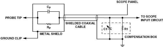 一般来说,无源探头的电缆存在8-10pF/foot的容性负载(1 foot 英尺=12 inches 英寸=0.3048 metre 米),1.5nS/foot的上升时间。 对于一个6feet的电缆就存在60pF容性,加上一般示波器的20pF的输入电容以及一些杂散,大致为90pF左右。根据1:10的分压,探头的输入电容应该为10pF左右才能满足 Vout/Vin=[10/10+90]=1/10 输入衰减10倍的特性。考虑到探头和电缆容性的一些误差,需要使用探头补偿电容箱来进行一个回路补偿,由于误差,无源电压探头的输入容性一般为8~12pF之间。目前主流的10倍无源电压探头的输入负载模型一般都是输入电容8~12pF,输入电阻9M欧.