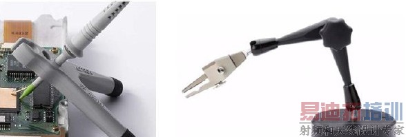 手持的的方法虽然方便但不可靠也不能持续很长时间。最简单的脱手测试方法是把探头套在一个2 腿的探头夹上,依靠重力压在被测点上。对于一些复杂的场合,还可以选择3维的探头手臂,其可以把探头夹住并根据需要调整探测的位置和角度。这种3 维的探头架要做得好的话价格很贵,甚至会超过一个普通无源探头的价格,所以只在一些特殊测场合才会用到。