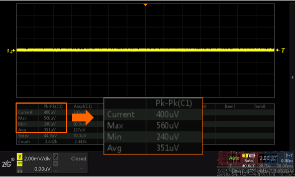 由于示波器屏幕上显示的是噪声的峰值偏移,所以对示波器底噪最直观的测量参数就是峰峰值测量。屏幕上显示的就是ZDS2022示波器的底噪,我们可以看到非常低。
