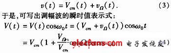 调制的作用是使载波的振幅Vcm随调制信号vΩ而相应的变化,从而得到调幅波。调幅波振幅变化的轨迹即波峰点的连线称为包络线。调幅波包络线的瞬时值为: