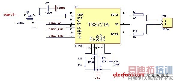 超声波热量表通过MBUS(Meter Bus)总线通信进行自动抄表。现场的热量表可通过MBUS将数据上传到集中器,然后由集中器或再上一级集中器将数据通过以太网或无线GPRS通信模块将数据传输的供暖中心的后台,进行计费及管理。本方案中采用TI公司的MBUS芯片为TSS721A。TSS721A是一种用于仪表总线的收发器集成芯片,其内含接口电路可以调节仪表总线结构中主从机之间的电平,同时该收发器可由总线供电,对从机不增加功率需求,总线可无极性连接。TSS721A的连接电路如图4所示。